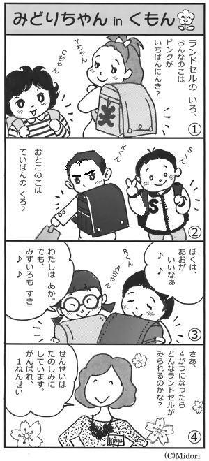 ショッピングセンターやデパートにたくさん並んだ今時のランドセルのカラフルなこと! 棚に並んだランドセルさん達は、きっと、お客さんが通るたびに、どの子に選んでもらえるか、ドキドキしていたことでしょうね。