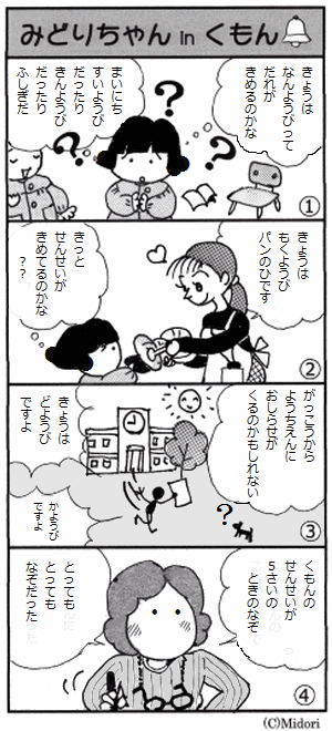 昔々、幼稚園の頃、誰が曜日を決めるのか本当に不思議でした。園庭から向かい側の小学校の校舎を眺めながら、「そうだ。あそこからお知らせが来るのかもしれない。」 曜日が巡ることに自分では気付かず、誰かから教えてもらうチャンスもないまま~~古き良き時代のおかっぱパーマの私でした。